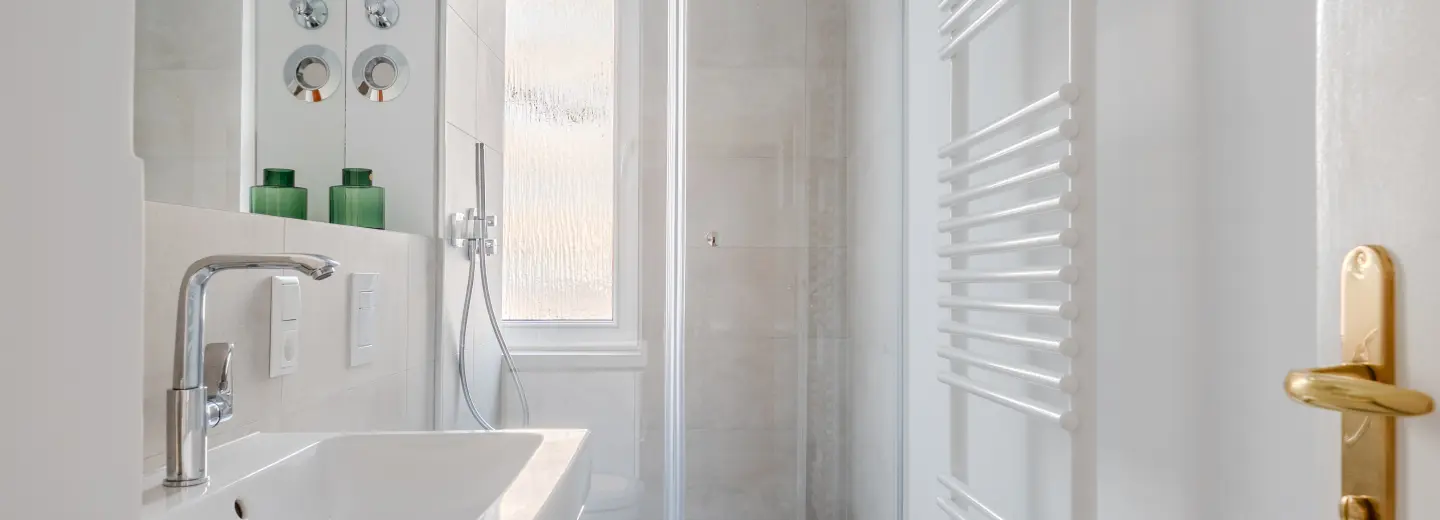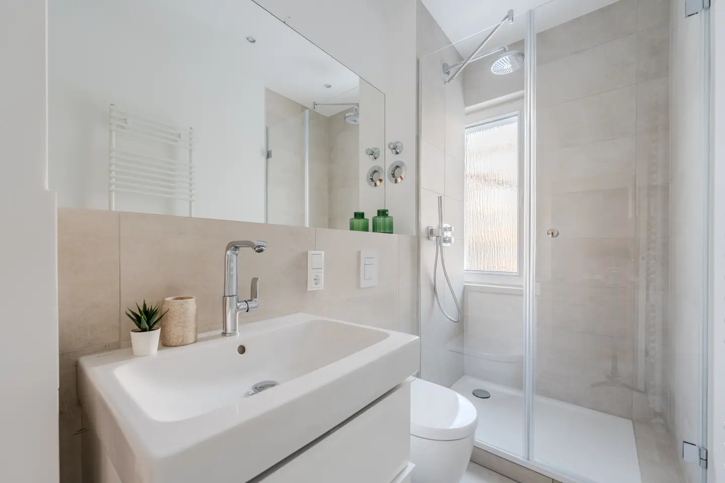Genießen Sie den Komfort von edlem Eicheparkett und die Eleganz von Stuckdecken, die den Räumen eine besondere Atmosphäre verleihen. Das Badezimmer ist mit hochwertigen Duscharmaturen, einer Regendusche und einem praktischen Handtuchtrockner ausgestattet und lädt zum Entspannen ein. Ein Balkon rundet das Angebot ab und bietet einen privaten Rückzugsort im Grünen.