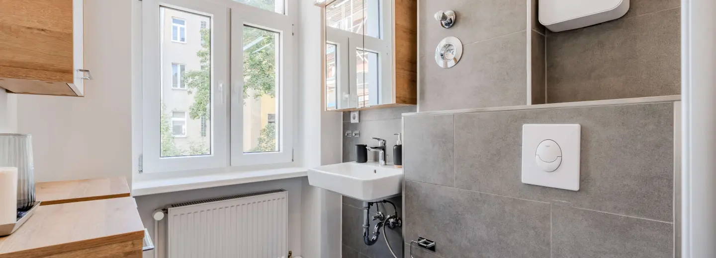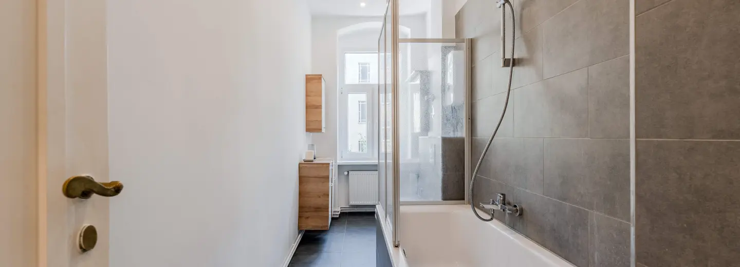 The separate kitchen of approx. 11.50 m² is fully modernised and designed with clean lines. It offers both high-quality appliances and enough space for a dining area by the window. The bathroom of approx. 6.06 m² is finished with contemporary tiles and and a window for natural light and ventilation.