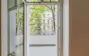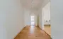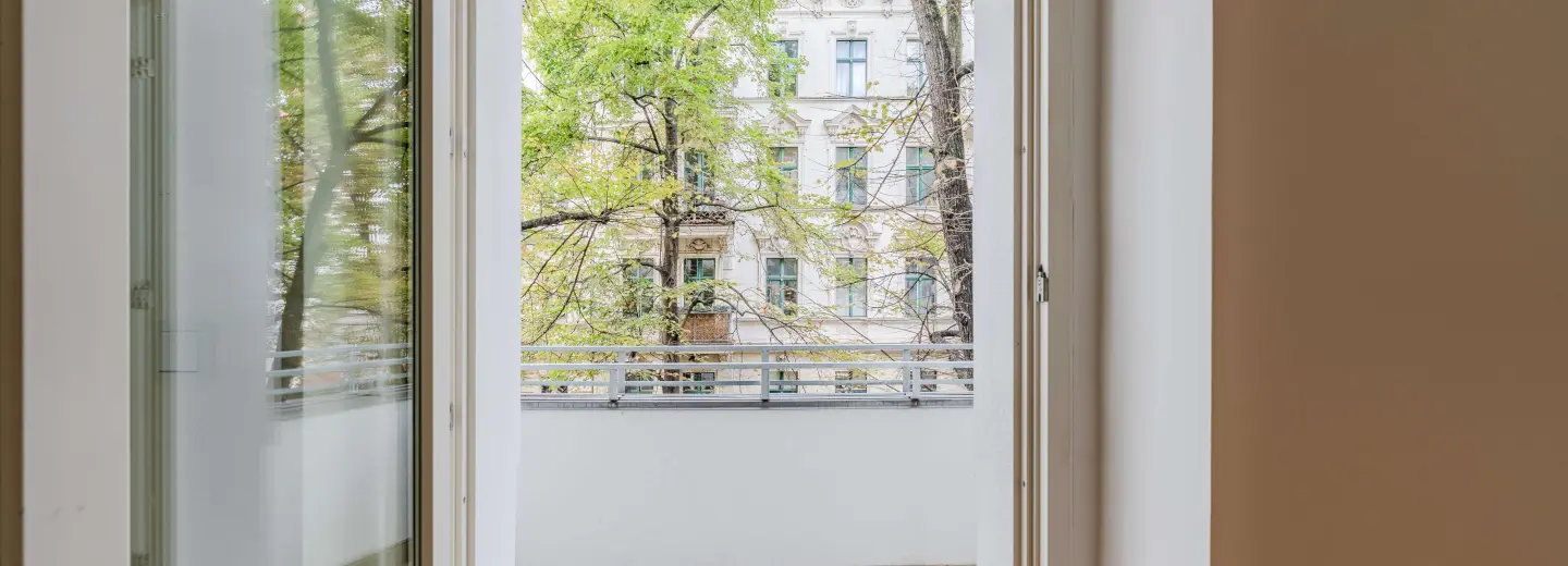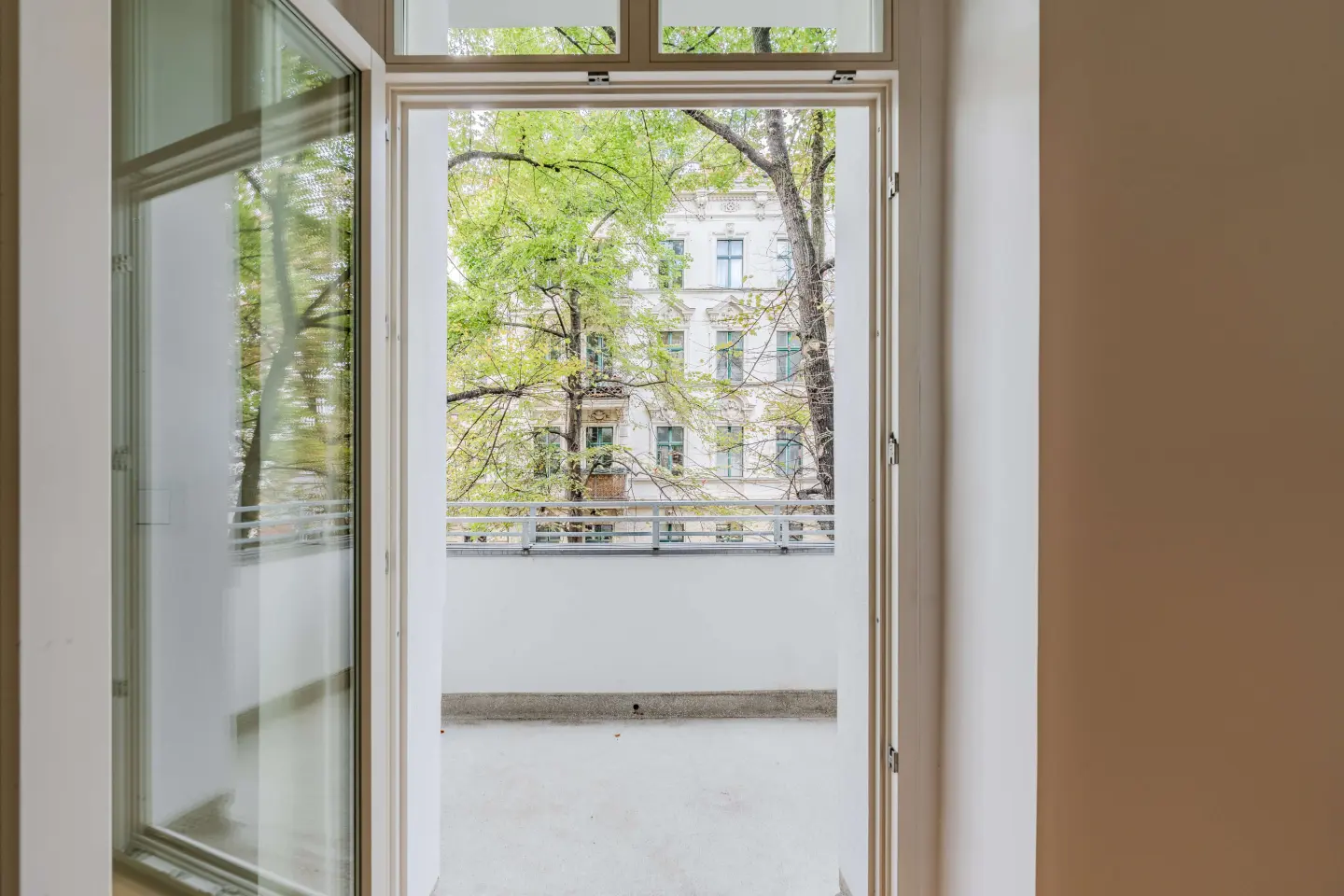 Upon entering, a practical hallway of about 5.56 m² sets the tone with its clarity and sense of space, leading directly into the bedroom of approx. 13.95 m². From here, original double doors open into the spacious living room of approx. 22.56 m², where high ceilings of over 3.1 metres, stucco details, and restored wooden floors create an unmistakable Altbau elegance. From the living room, French doors lead onto the balcony, offering leafy views and a tranquil retreat in the middle of the city.